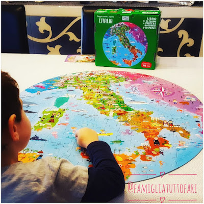 Una valigetta che contiene un bellissimo e ricco puzzle dell’Italia e un piccolo libro, ben fatto, dove potrete trovare alcuni giochi da fare con i bambini, con alcuni aneddoti e ricette da ripetere con i propri figli.