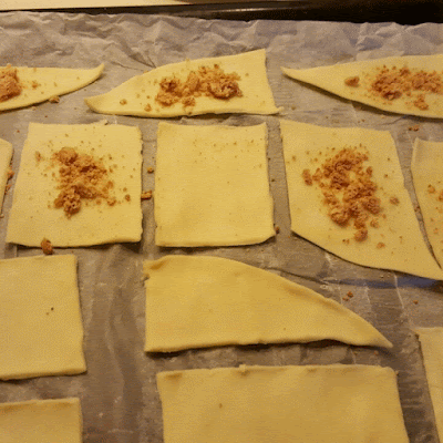 1) Prendete un rotolo di pasta sfoglia, (meglio quadrato ma se è rotondo va bene ugualmente!) allargatelo sulla sua carta e tagliate delle strisce (circa 8cm per 5cm).